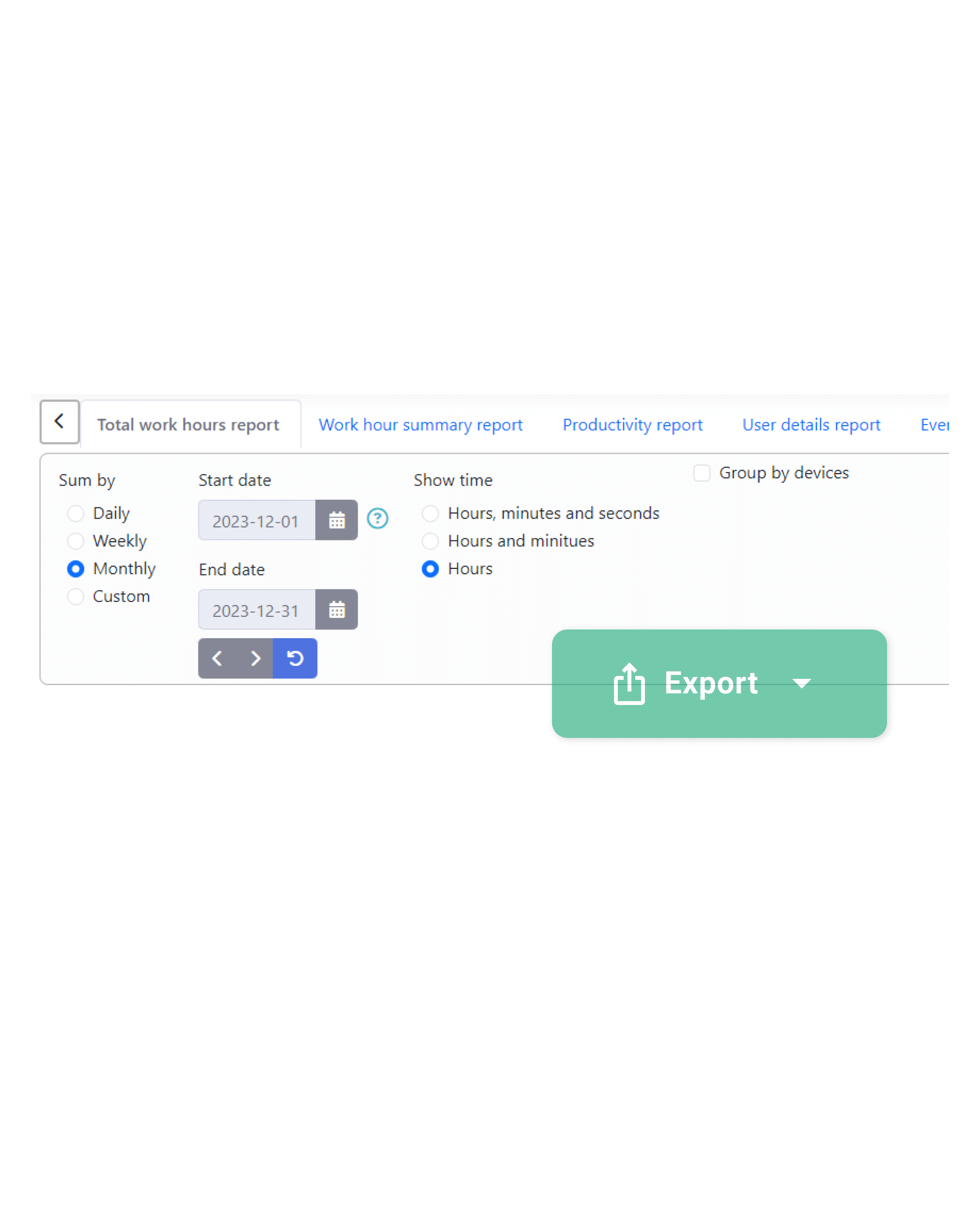 NCheck Bio Attendance effortlessly exports employees' daily, weekly, or monthly attendance records to Excel via the Total Work Hours report.