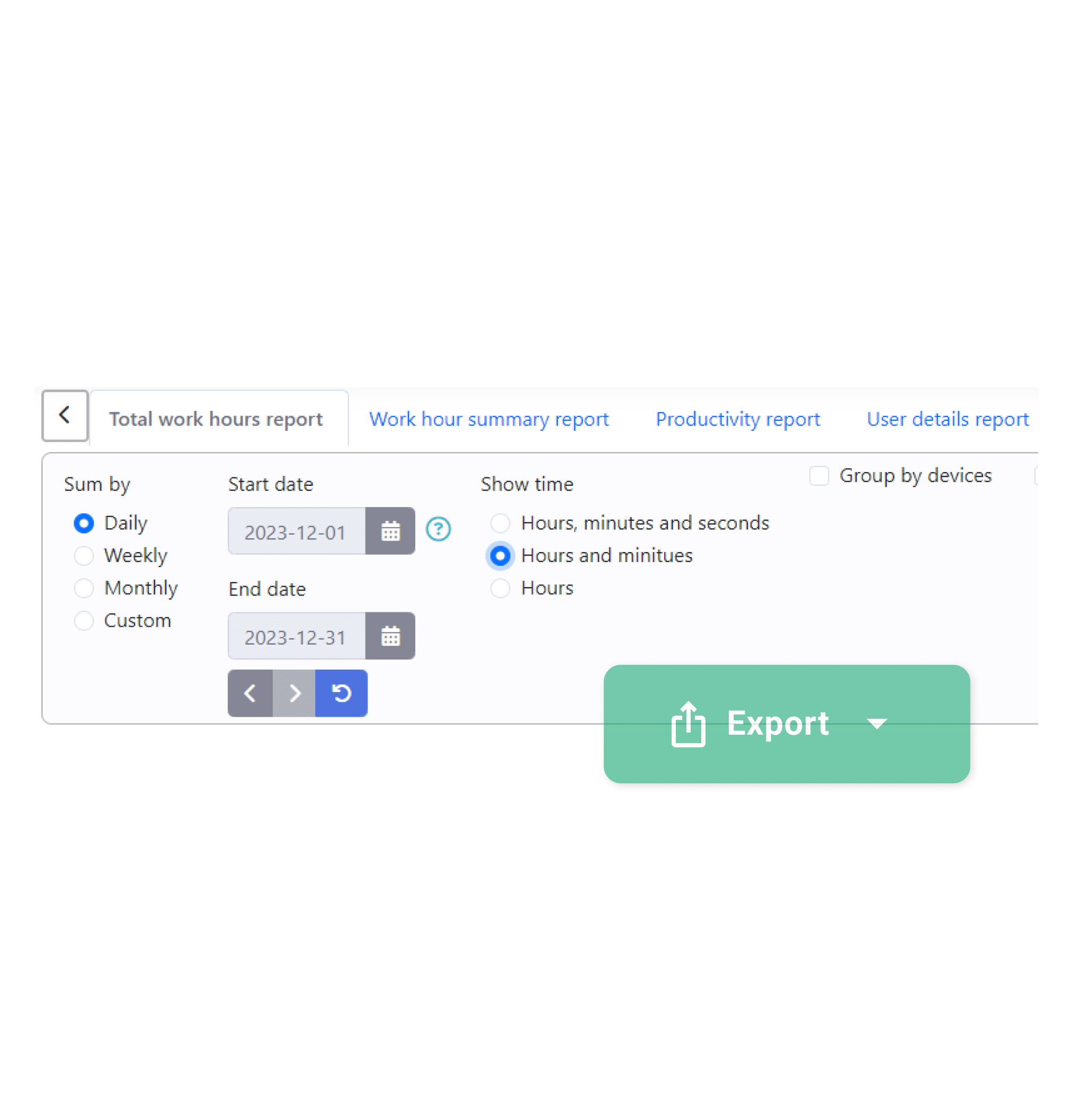 Select employee attendance data (Daily, Weekly, Monthly, or custom) and export payroll data based on your requirements.