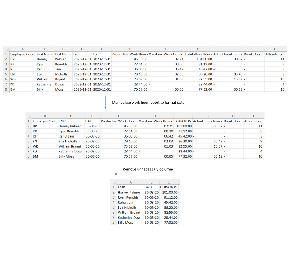 Manipulating a Total Work Hours report optimizes data for efficient integration by adjusting formats and removing unnecessary data.