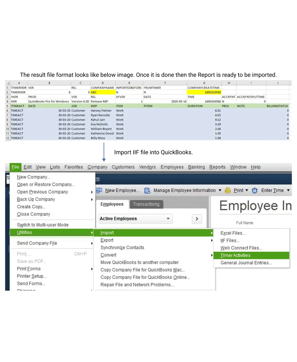 In QuickBooks Desktop, you can import timesheet data using IIF (Intuit Interchange Format) files. IIF format is a text-based tab-delimited format similar to .tsv.